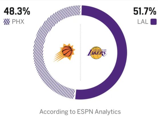 反观太阳,赛前战绩为44胜36负,早已基本锁定西部第七,球队现阶段战意并不算强,更多是以赛代练、调整状态,为季后赛做准备。上一轮他们主场击败独行侠,近五场比赛拿下第二场胜利。对阵独行侠时,布克登场37分钟,交出37分5篮板9助攻的亮眼数据,狄龙也砍下28分。四月复出的狄龙赶上了季后赛末班车,也正通过实战慢慢找回比赛节奏。本场太阳已经坐稳西部第七,季后赛附加赛主场将对阵开拓者,本场基本无欲无求,打法也会更放松。赛前ESPN预测本场比赛的结果:太阳胜率48.3%,湖人胜率51.7%。